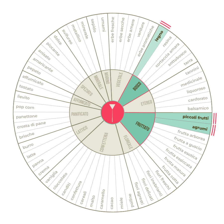 Evoca al naso un sottobosco rigoglioso insieme ad una nota mediterranea, agrumata e legnosa. In bocca, un'onda fresca e avvolgente di Arancio e Mandarino, addolcita dalle bacche e dalla radice di Liquirizia, rimane a lungo abbracciata al palato.