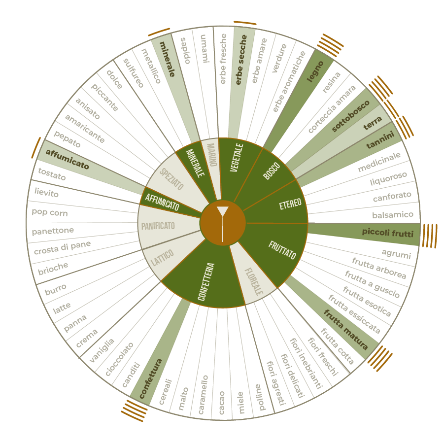 I sentori organolettici riportati sopra vogliono arricchire l'esperienza di assaggio, offrendo un semplice spunto per avventurarsi all'ascolto del proprio sentire. Per la predisposizione di queste note, abbiamo usato un'acqua a basso residuo fisso e a ph leggermente acido; usare parametri diversi può far variare l'estrazione e di conseguenza le percezioni organolettiche.